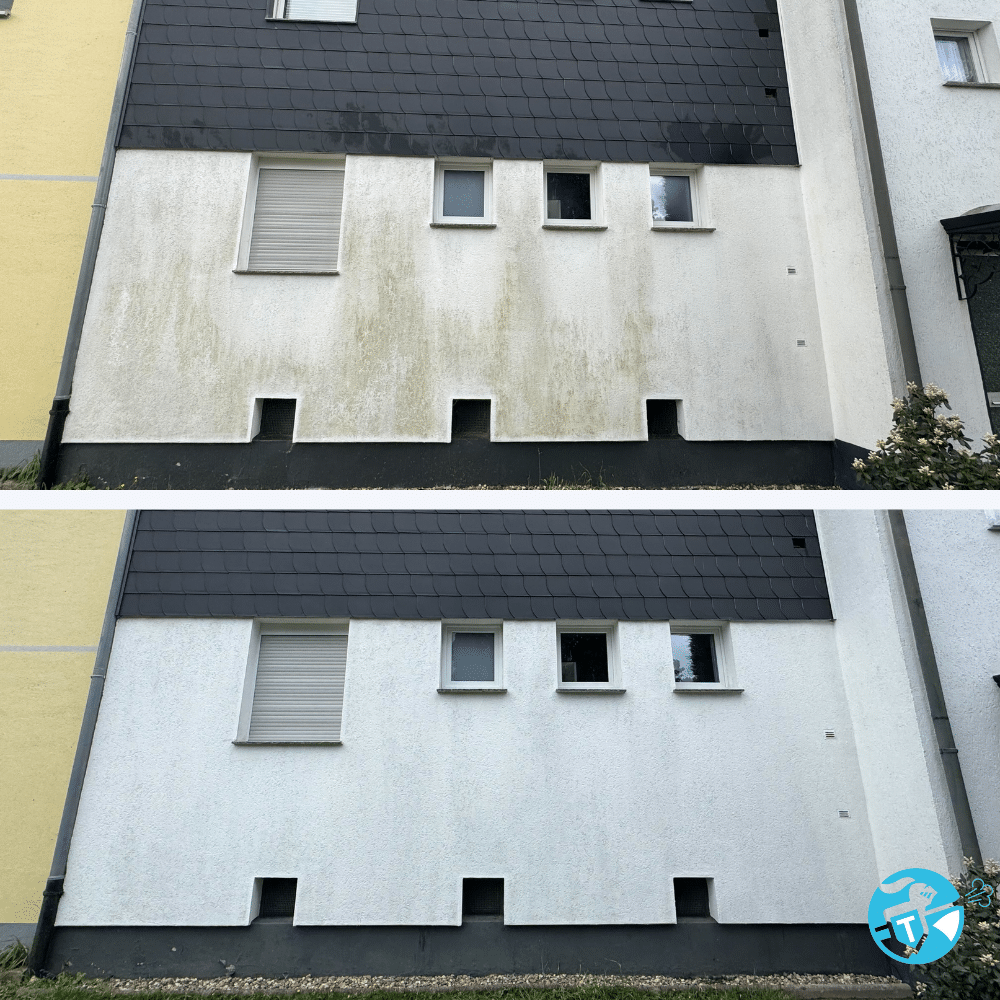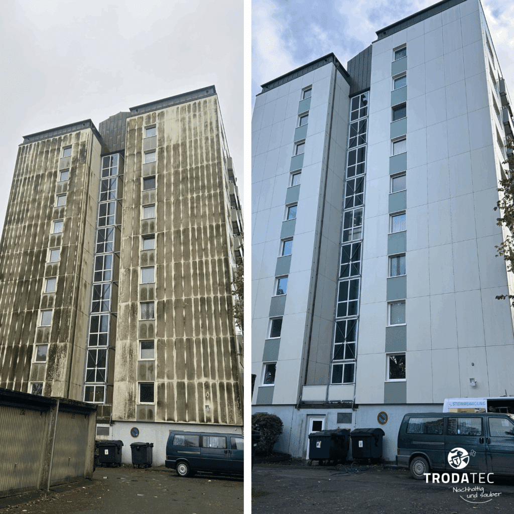 Ja – mit TRODATEC SE bis zu 80 % günstiger als ein Neuanstrich. Unsere Reinigung entfernt Algen, Schmutz und Witterungsspuren. Ergebnis: sichtbar saubere Fassade mit Langzeitschutz und 5 Jahren Garantie.